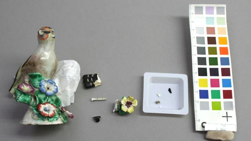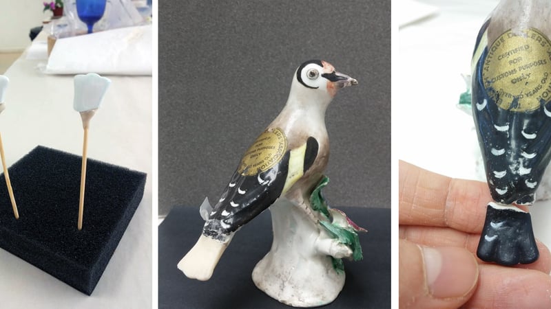 The figure was broken into 7 fragments. The key detachments were found at 1) tail, 2) right leg, 3) yellow protruded flower at upper right corner of the stem and 4) beak. Previous restoration work was revealed. The detached tail was a replica and made up of other material (possibly plaster). There were traces of old adhesive material left at the bonding edges. Old retouching was also found on the tail and leaves. There appeared to be areas of loss and some retouching areas to some green leaves; however, this may prove to be manufacturing faults of the original design or not, moreover the retouching is in good condition, so no conservation treatment is needed to compensate the loss or remove the old retouching. Overall the surface was mildly dusty.