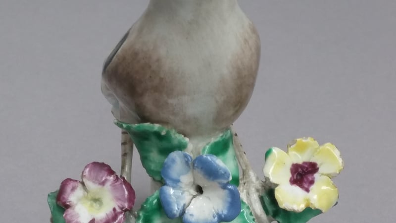Two labels are attached on the figure. One is at the back of the goldfinch and the other was found underneath. The labels were to remain attached.