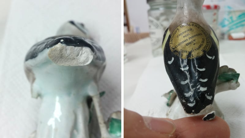The detached tail is made up from a different material, identified through microscope analysis at the cross section view. Previous colour retouching is found-although nicely done, the paint layer is now cracking.