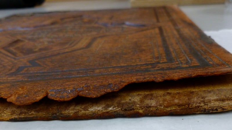 The brown calfskin covering the volume has been heavily deteriorated and shows the characteristic orange red powdery texture of "red rot", the acidic deterioration of leather, observed on leathers especially from the mid-19th century. The distinguishing smell, which is the same as the one I often smell in second-hand bookshops or libraries with old books, was also confirmed from this red-rotted leather.