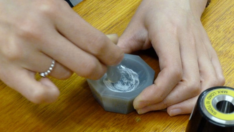 After consulting people in the Metals Department, the green copper alloy corrosion was scraped off with a scalpel under a microscope. Particularly under the microscope, the corrosion's bright green colour was very beautiful next to the copper alloy's gold colour, so I kind of wanted to keep them. But instead of keeping it on the furniture, because it would continue to corrode and cause damage, we collected and analyzed it with the FT-IR spectrometer.