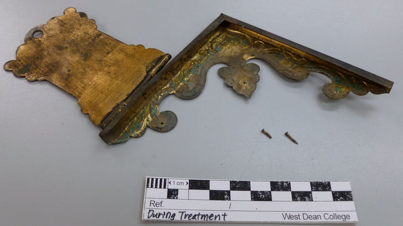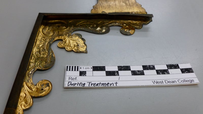 We will go on to the cleaning of the brass furniture with IMS followed by a protective coating of microcrystalline wax, as well as repairing the hinges. Once the furniture is ready, it will be reattached on the board with new nails.