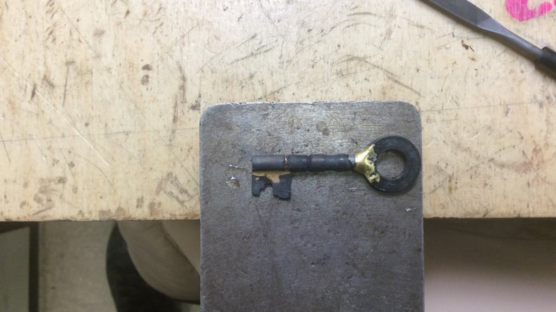 The next step, and possibly the most infuriating was to stick the bit and the stem together. Although the proto-key was welded, a more historically accurate method was necessary for the real thing, so brazing was chosen (and also because I love brazing). The bit of the key had to be bound in place to the stem and kept in the correct position. This is easier said than done. So after around 45 minutes of intense concentration, and with the aid of a few rude words, the bit was held in place and ready to braze! (You may notice the poor focus in the below picture, please excuse this, as it was due to the aforementioned frustration!)