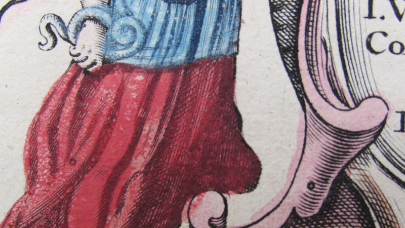 The first concern, before the book could even be surface cleaned, was the stability of the pigments. The water damage had solubilised the binder in the pigments used during the hand-colouring, causing them to move, and dry as a fine, powdery dust. The blues and reds were the most heavily applied and, thus the most damaged. At first glance, the colouring on the maps had appeared fairly crude, but its possible that the water damage actually moved the pigments. The artist may well have been better at staying within the lines that it now appears!