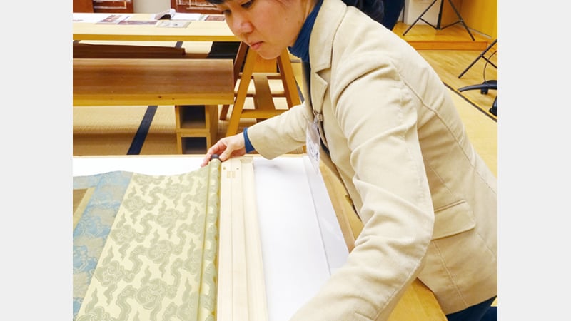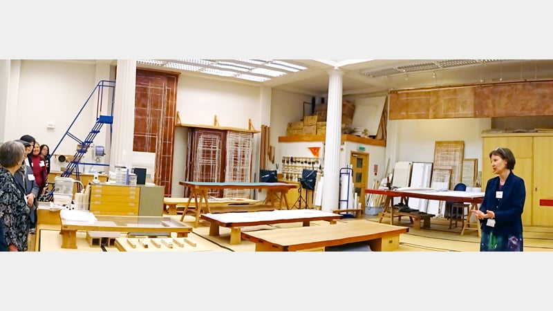 My second studio tour was at the British Museum, where I managed to visit the the Hirayama Studio (ありがとう Matsuda sensei) twice! The Hirayama Studio specialises in the conservation of East Asian paintings on paper and silk, and resides in a special historical building on the museum site. The central working area is raised on a platform and covered with tatami mats, with both low-working tables and karibari boards (Japanese mounting studio style), and red lacquered tables (Chinese mounting studio style). The studio has a huge stock of Japanese kozo papers, Chinese xuan papers, and the prettiest silks!