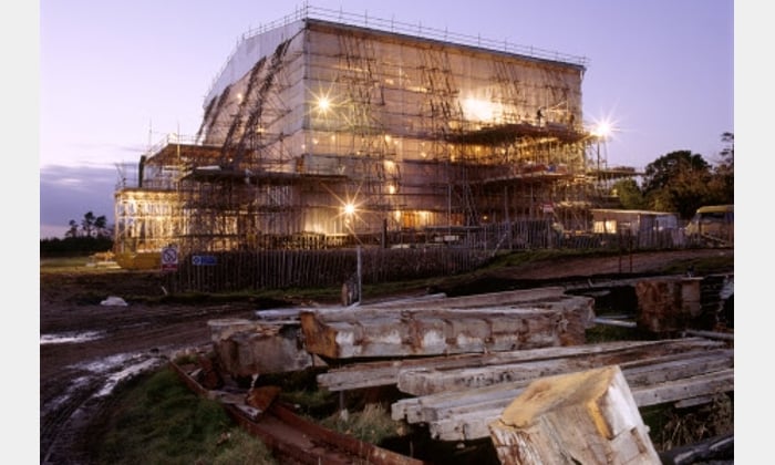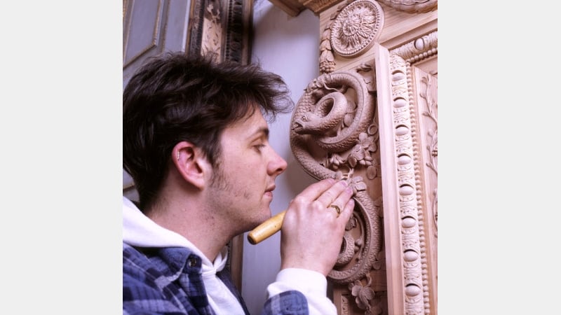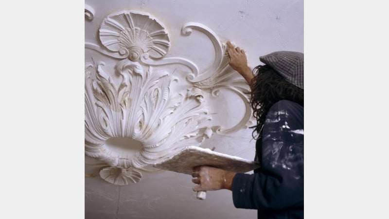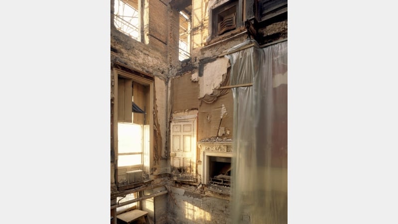 There were five wonderful late 17th-century and 18th-century stucco ceilings to the groundfloor rooms reduced to several thousand fragments, most extracted from the ash. To recreate these against an insurance-driven timetable which allowed less than a year from a standing start, with not enough skilled conservators and stuccoists for the timescale and a desire to keep and refit decorative (often gilded) fragments into the new ceilings like plums in the pudding, was hard enough; but then the main contractor went bust at the critical point. Somehow we kept going, kept the stucco team together and ceramic artists were recruited from advertisements in art magazines to apply their skills in this new way. Paterae, dentil cornice blocks and run plaster mouldings were copied from surviving material; and the skills of applying stucco and running lime plaster cornices learned working upside down, like Michelangelo, in a large tin shed on-site with many mishaps along the way. The end result was astonishing, proving beyond doubt that the apogee of these skills in the 18th century could be matched in the 20th.