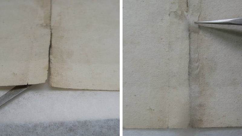 When a tear occurs, there are small losses that cannot be seen by the naked eye. Trying to put the tear back together will not be perfect because the surface is irregular. Mending the tear helps fill those tiny areas of loss so the paper fits back together as seamlessly as possible.