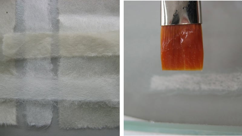 One of the main reasons for using Japanese paper is the characteristic of the paper. The front and back of the Japanese paper are slightly different in that one side has a little more texture, roughness, than the other. The side that has the texture will be face down to the tear. The fibers (Image 2) of the Japanese paper will link with the fibers on the paper being treated. This will make a strong but gentle bond within the repair on the surface. The Japanese paper acts as a patch for the tear (Image 3).