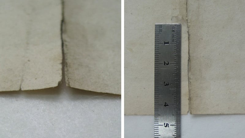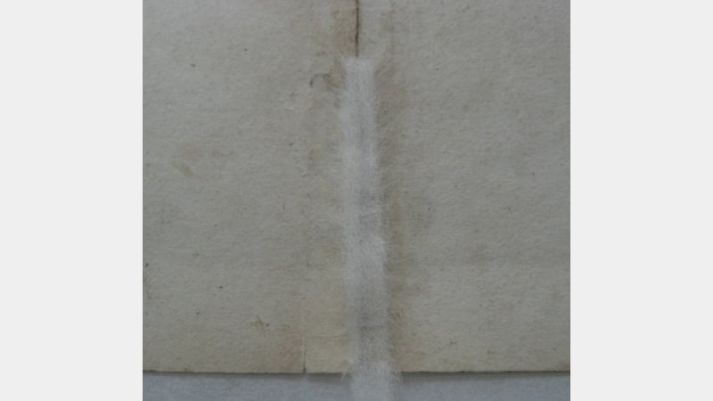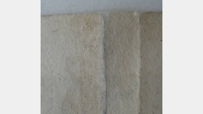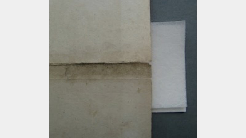 The type of paper used for a tear repair varies from object to object. Japanese paper is made with different types of fiber and are a variety of thicknesses (Image 1). The type of Japanese paper chosen for the tear is specific to each paper being mended. What is fundamental with mending is that the paper used to mend should be weaker than the object. The repair, if it should tear, should tear before the object as well as not to expand and contract more dramatically than the object so the object breaks before the repair. That is one of the purposes for the repair, to prevent further damage to the object. It can be either handmade paper or machine-made paper as long as it matches the requirements for the tear that is being treated.