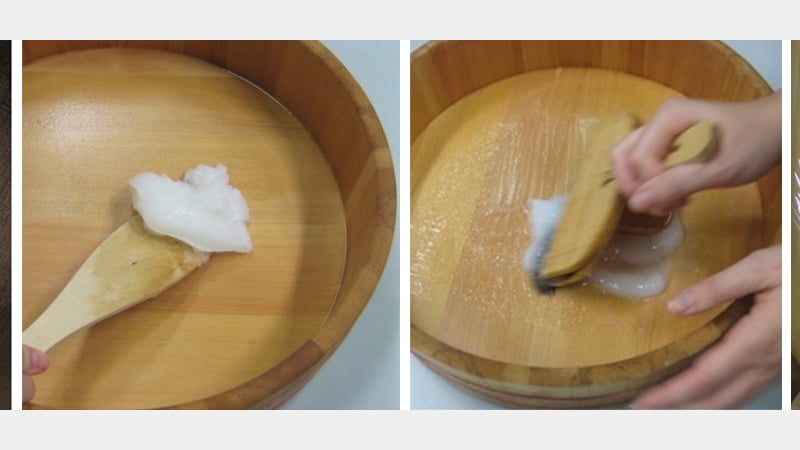 After the paste has cooled to room temperature, it should be pressed through a damp hair sieve. This will make the paste smooth so applying the paste to surface will be a more even application. If the paste is still not at the desired consistency, mixing in more water will dilute it. Images 4-14 demonstrate one method of how wheat starch paste can be prepared.