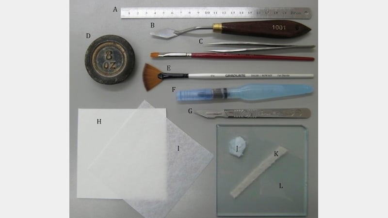 The tools (Image 15) used for a tear repair can vary, but one piece of equipment is necessary: tweezers. Tweezers allow for a precise placement of the Japanese paper over the tear being treated. A palette knife is used to mix the wheat starch paste on the glass plate. The brush is used to apply the paste onto the Japanese paper. The tweezers because once the paste is brushed on the Japanese paper, it can be difficult to remove without the tweezers from the glass surface to place on the tear. The ruler is for measuring the tear and to help cut the Japanese paper to the appropriate size for the tear. The Bondina® and blotter paper pieces are used once the repair has been placed. The blotter paper soaks up the extra moisture from the Japanese paper, and the bondina acts as a barrier between the object and blotter so they do not stick to one another. The weight is placed on top of the blotter to add a small amount of pressure so the paper will not wrinkle as it dries.