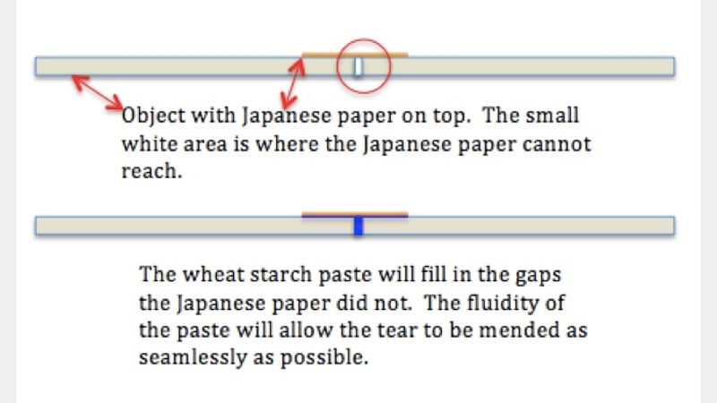 The key component to tear repairs is the wheat starch paste. The consistency of the paste does depend on the materials that are chosen, and the state the paper is in during treatment. The paste is more than just a layer between the object and the Japanese paper. The paste will go between the fibers of both the Japanese paper and the object being treated. The paste will go where the Japanese paper cannot and flow into those irregular areas caused by the tear.