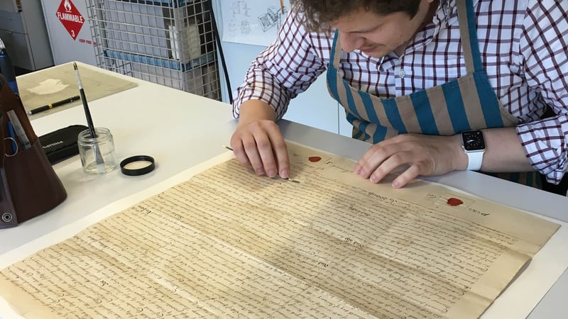 Recently the Archives accessioned papers from the family of Charles D. Walcott, fourth Secretary of the Smithsonian, famous for his panoramic photographs of the Canadian Rockies. The papers included this 1740 indenture or contract that describes a property transaction in New York Colony between a Dutch couple and a widow. The document had been folded and despite losses to the paper along those folds, the wax seals remained intact. After locally humidifying the indenture to relax the folds, tears were mended with a thin, almost transparent tissue, while fills were made from a sympathetic Western paper shaped precisely to fit the lacunae and held in place by a backing of the same thin tissue.