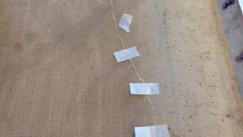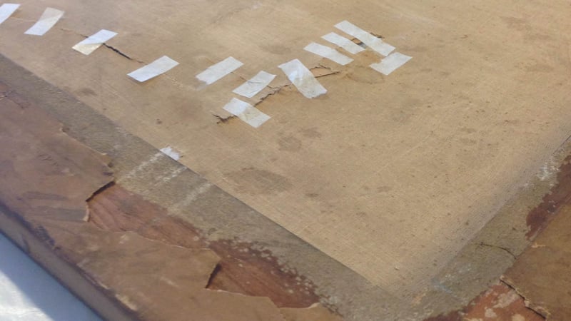 These photographic crayon enlargements, associated with William Temple Hornaday (founder of the National Zoo) were made on sensitized paper that was then adhered to a stretched linen "canvas". They were first removed from the stretchers by carefully working the linen out from under the rusted nails holding it in place and then lifting away the wooden frame. Tears in the enlargement were stabilized with a heat-set tissue I prepared with the acrylic adhesive Plextol B500, that has sufficient tack to be supportive and that flowed nicely into the weave of the linen, while still easily reversible. The mended enlargements were then mounted on backing boards with Japanese paper strips that attached to the back of the image and then wrapped around to the rear of the backing board. Detaching areas of the paper across the objects were then gently tacked into place with Lascaux adhesive films.