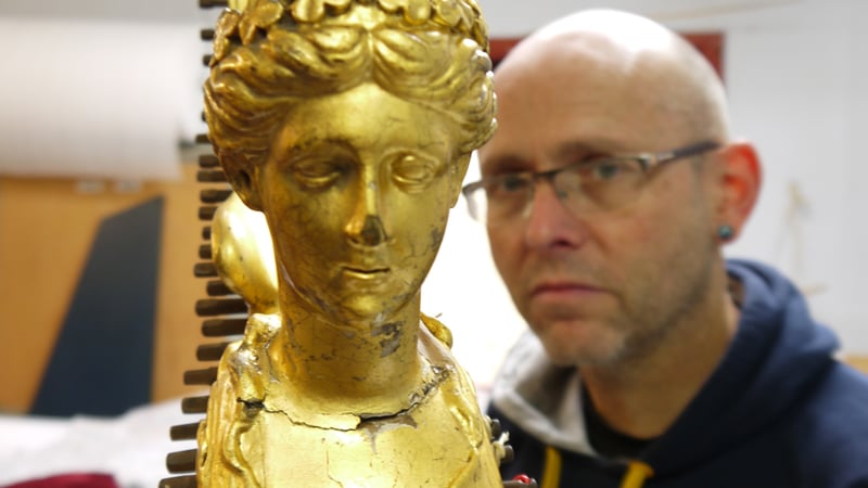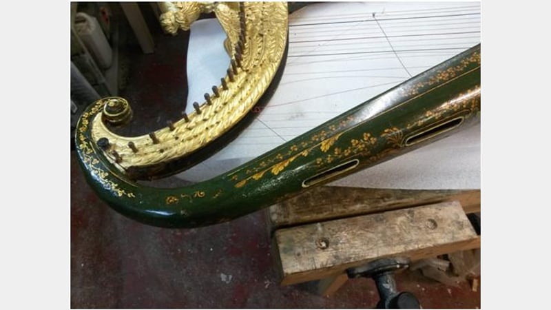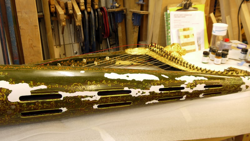 The highlight of my time in the studio was conserving a gilded and japanned harp owned by the Royal Academy of Music. It is known as the "Royal Portable Irish Harp" due to its special connection with King George IV and was made in 1820 by John Egan of Dublin, Ireland. It is also one of a pair known in existence; its twin is catalogued in the book Trois Siècles de Harpes (Rensch 2004).
