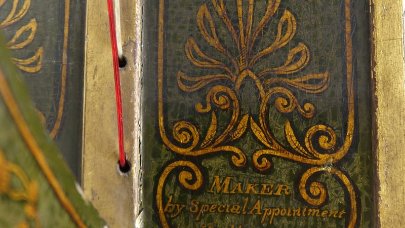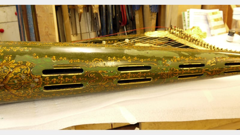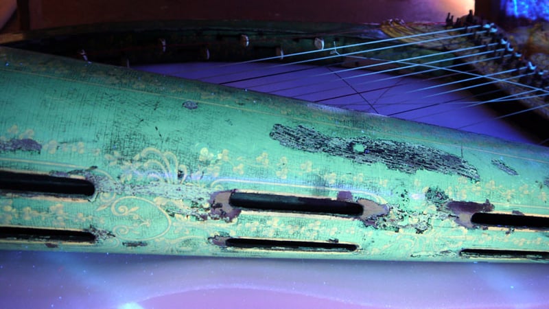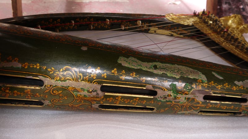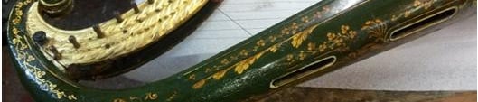 This harp is particularly special as a rare technique of japanning was used on it. Underneath the green japanned layers, a base layer of gold leaf had been applied onto the wood substrate. Apparently, this was a particular technique used with green japanning to confer an additional brilliance to the object's appearance (Williams 1913). Not many green japanned objects made using gold leaf as a base are known to exist.