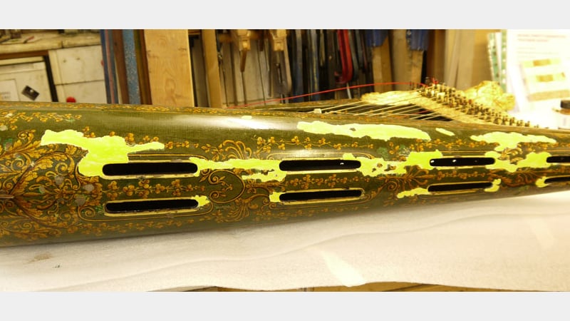The japanned surface had numerous losses all over the instrument and in most cases the decoration had been lost down to the bare wood. The task was to figure out the technique of japanning originally used, in order to recreate the lost decoration and reinstate a harmonious overall aesthetic appearance. We did not plan to employ traditional japanning methods to replace the losses, but instead would use modern conservation materials that would result in a seamless blend with the original japanned surfaces and yet allow for future re-treatment of the conserved areas.