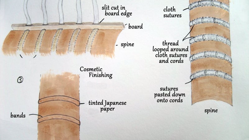 Sometimes you may wish to leave the volume with the cords exposed to better show the work that has been carried out on it but often aesthetic considerations must be taken into account. The third section of the diagram, labelled cosmetic finishing shows how the extensions may be covered up. By tinting some Japanese paper to the colour of the spine small pieces can be moulded over the exposed areas to give a neater, uniform appearance.