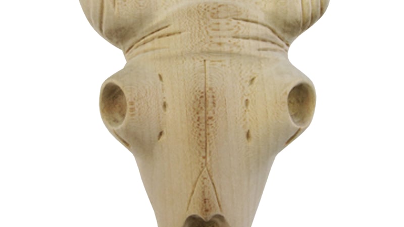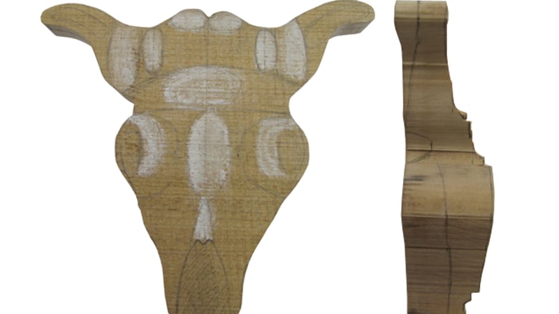The clay model was then used to mark the outline of the motif onto a block of solid lime wood. A loose bucranium from the proper right front corner provided a glimpse of the timber used for the original carvings, however a thick layer of paint made it very difficult to identify definitively. Although the table is described as having a pine substrate, it is possible that the carvings were made in a different wood and visible grain suggested something finer than pine. It was therefore decided that lime could be chosen as a suitable substitute.