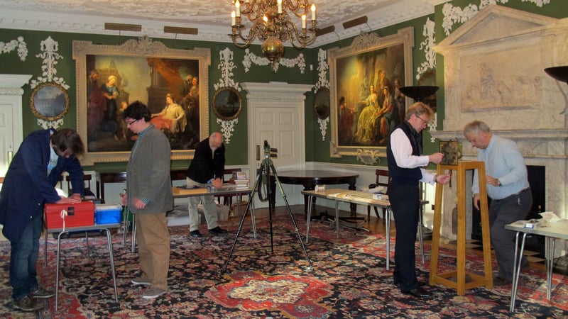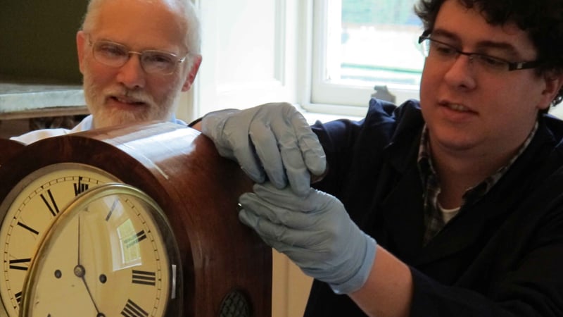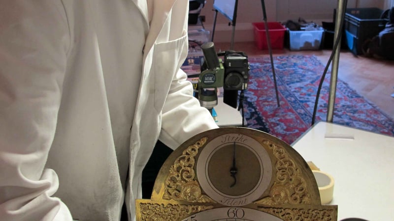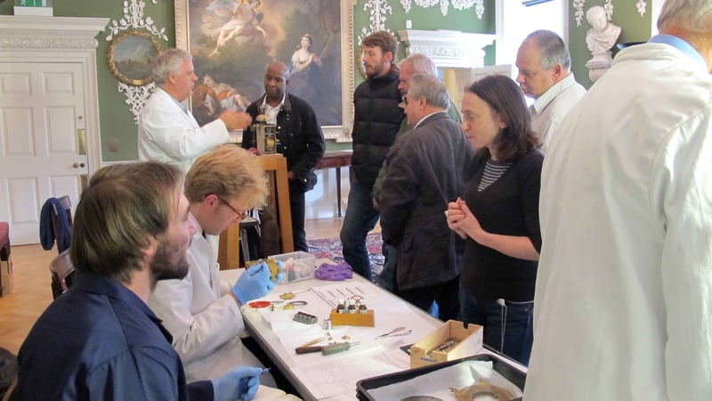 We arrived early on Saturday morning and set up our workshop in the centre of the Picture Gallery. Within this inspiring setting Matthew and the students began their work of dismantling, photographing, recording, assessing, cleaning and oiling the clocks in turn. At 10.00 the doors opened and the room was soon buzzing with visitors fascinated by what was being done. We also treated them to formal gallery talks. Using a handling collection, we demonstrated how historic clocks run and more importantly how conservators preserve them for future generations.