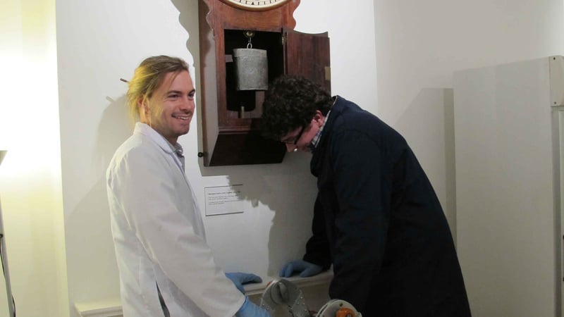 Under the banner of The Centre for Conservation and Making, five students from the Clocks Department attended "The Clock Watching" weekend event with tutor Matthew Read (and me). The event was a celebration of all things related to time. Our remit was to overhaul the excellent collection of clock movements within one of the historic galleries, under the gaze of the visiting public.