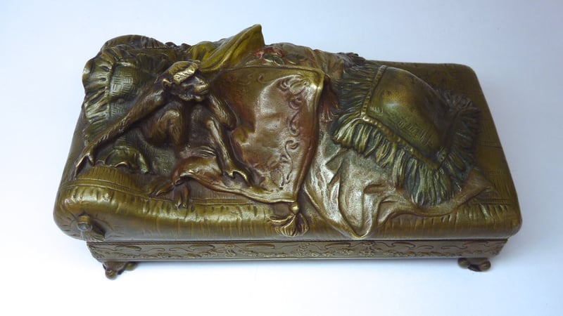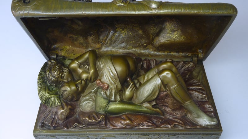 The metals department at West Dean College has recently acquired a small bronze casket, believed to be made by Franz Bergman. In 1860 he founded a small bronze foundry in Vienna where he produced many patinated and cold-painted bronzes. Cold-painted bronzes refer to sculptures produced in Vienna and finished using layers of unfired "dust paint" otherwise known as polychrome paint. He is now renowned for his vibrantly coloured bronzes using this painting technique. Bergman's work is extremely varied but often depicted oriental, erotic and animal subjects, signing his erotic pieces 'Nam Greb' (Bergman in reverse) to disguise himself. Some of his erotic works were of young ladies in an art nouveau style with carefully hidden buttons or levers that revealed all if activated. In the case of the casket, there is a small keyhole concealed under one of the tassels on a cushion on the bed. The key unlatches the lid to reveal the love-making couple underneath the covers of the bed. It certainly is a surprising object and we feel very privileged to have the opportunity to conserve such an interesting artefact.