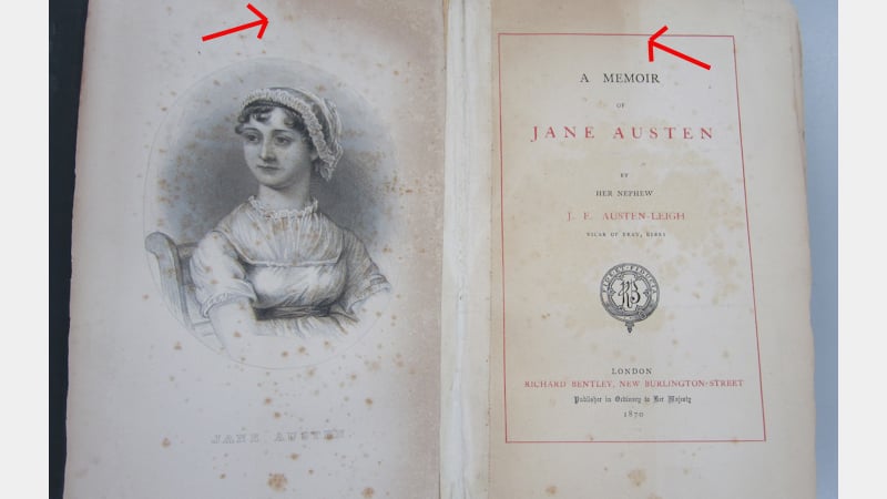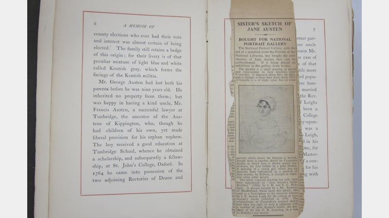 A newspaper clipping was found inside the book, tucked between the pages. The clipping refers to the sale of a sketch by Jane Austen's sister, Cassandra (this is the image on which the portrait used on the frontispiece of the book is based). Further research by Su Fullwood dates this sale to 1948, when the National Portrait Gallery purchased the sketch.