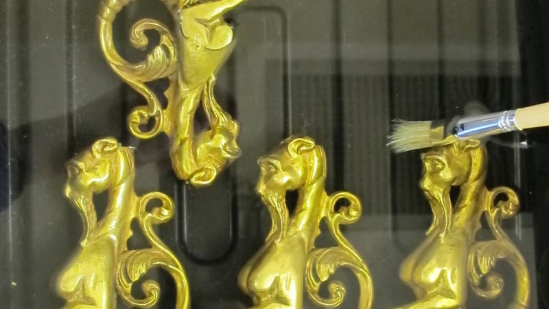 The movement and drive work were cleaned without using invasive techniques. One of West Dean's key strengths is that conservation departments work together on interdisciplinary projects; thus the glass was cleaned by students in the ceramics department and advice on cleaning the ormolu (using a specific mild detergent and deionised water) was supplied by the metals department.