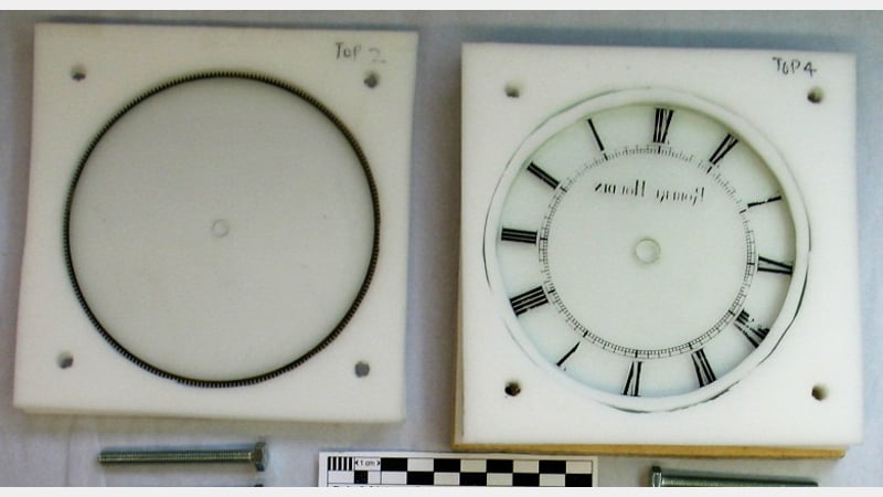 One of the glass tubes was cracked beyond repair so a new one was made and fitted. Fitting entailed removing cast brass bosses from both ends and re-gluing to a new tube, ensuring the tube was vertical to support the dial and keys within the two bosses were aligned with each other otherwise, the dial would not face forwards squarely. Alignment during the gluing stage was aided through the use of a precision lathe.