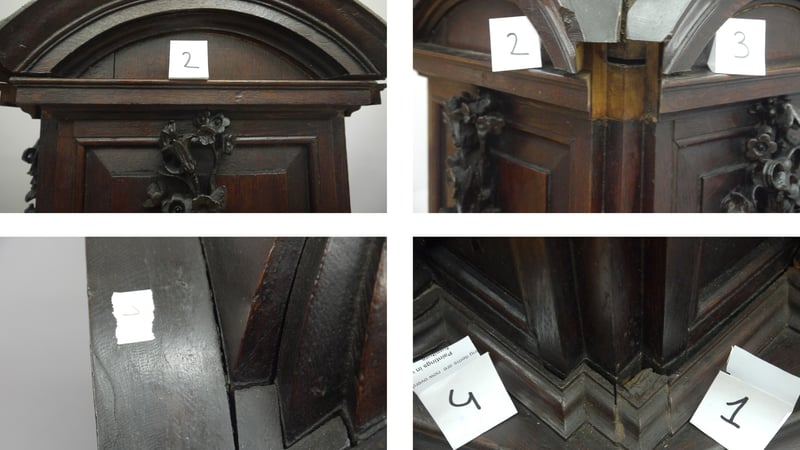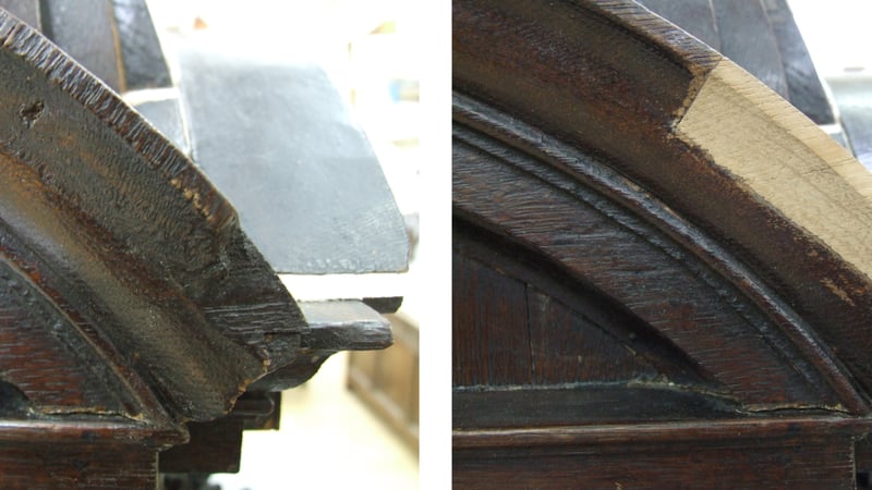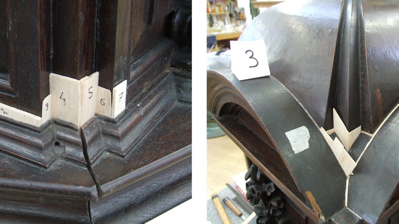 A frame and panel construction allows for movement in the wood; however, as this cover was made from solid pieces, many elements had cracked and become loose. The sides were cupped, pushing apart the octagonal base and moulded arches creating large gaps (up to 12 mm). When the font cover was lifted, the weight of the cover caused cracks to form on the domed top. Most of the gaps were filled in previous repair with a wood dust and animal glue-based gap filler, which had responded to fluctuations in humidity and come loose. The main treatment goal was to make it structurally sound and to reduce the visual impact of the multiple gaps.