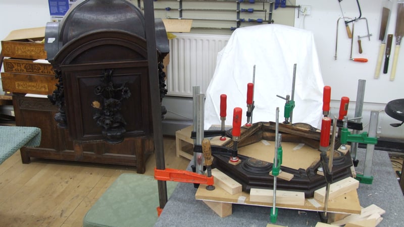 First stage of the conservation was to dismantle all the loose parts, remove old adhesive and re-glue using hot animal glue. The octagonal base was glued back with specially made jig to ensure that all 8 corners met accurately.
