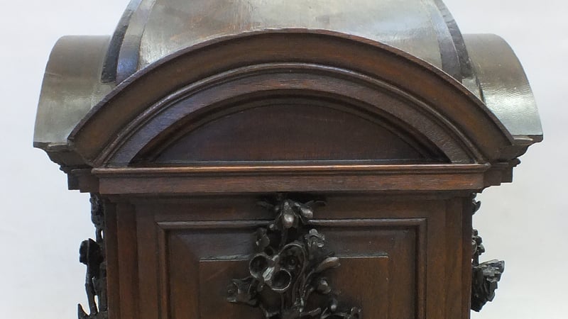 The cubical of the font cover is made of oak with an octagonal moulded base and floral carvings on each of four sides. At first glance they look like a frame and panel construction, but unusually they are made from a solid piece of wood and attached to the rail on the inside. The domed top is built around a cross section that sits on the rails. The gilded metal hook with four cherub faces is attached to the inner cross section.