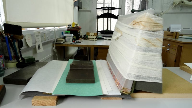 However, even after drying the boards under weights, they were still warped. Moisture was introduced to the boards with a blotter damp pack, create from alternative layers of wet and dried blotter and pressed so all blotters in the pile contain more or less equal moisture. This was used to flattening them, but, because of the nature of parchment, the boards wanted to warp in the wrong direction. A new solution had to be thought of, with the aim of warping the boards in the opposite direction to the way they wanted to warp, so that when dry, gravity would make it more or less flat. Therefore, a 'humidification bridge' was made - the board was suspended over two wooden strips and a blotter damp pack with a heavy weight placed over the top was left overnight. This had the desired effect and the board now lies flat.