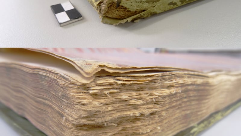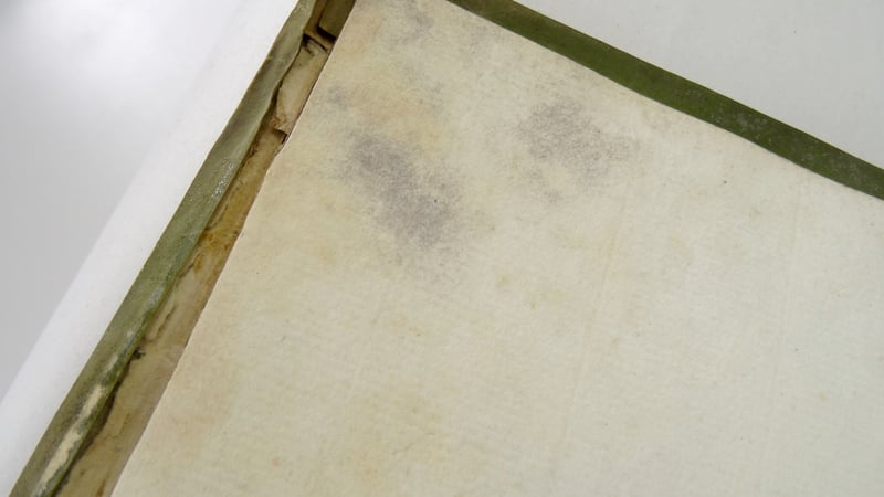 It was decided that the book would be repaired within the principles of minimum intervention - that is, stabilising the object with as little treatment as possible. First, the entire text block was surface cleaned with a smoke sponge and brush, taking care around the areas of softened, damaged papers. As there were signs of mould damage, the book was cleaned with local extraction to remove any harmful debris as a precaution.