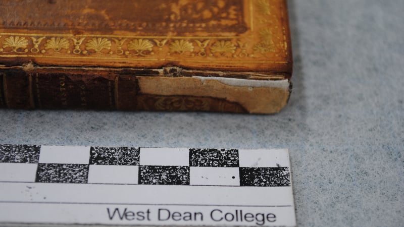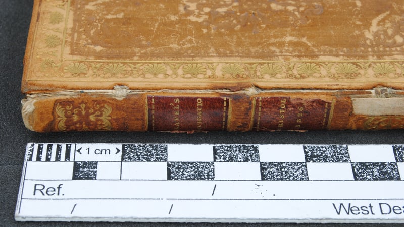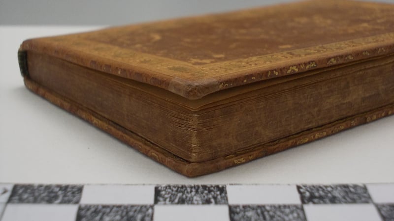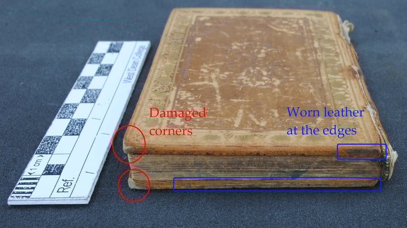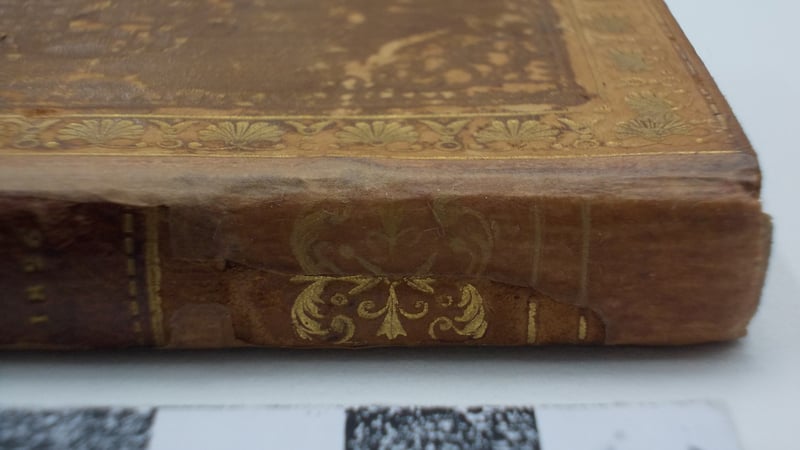 The front and the back boards were nearly detached and their attachment was fragile. All board corners were damaged and the leather was worn, fragile and discoloured.