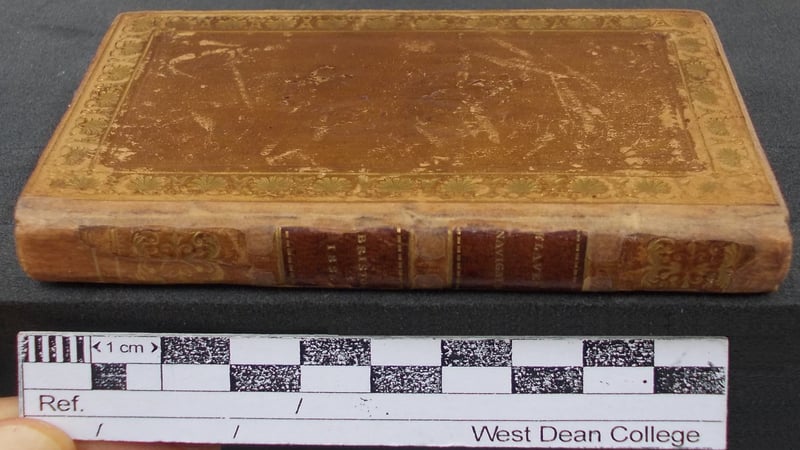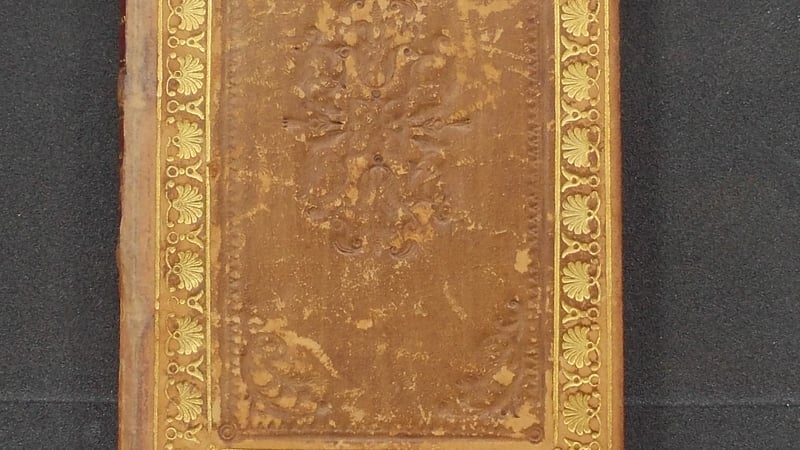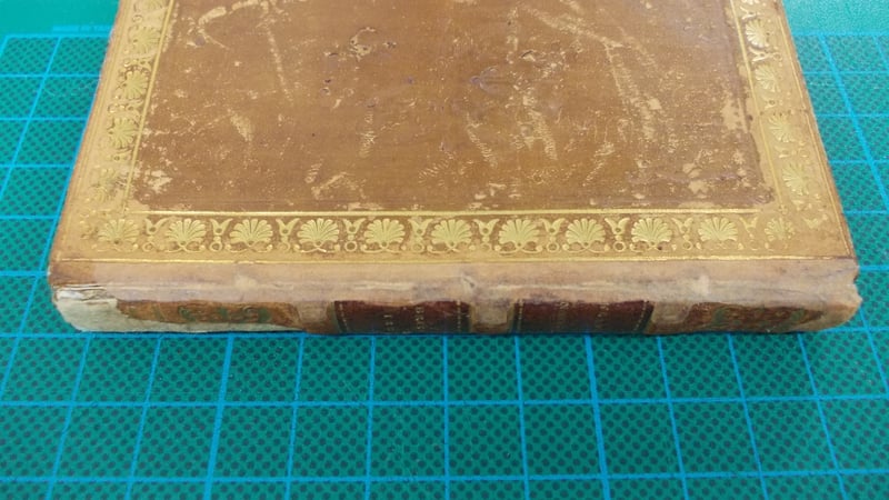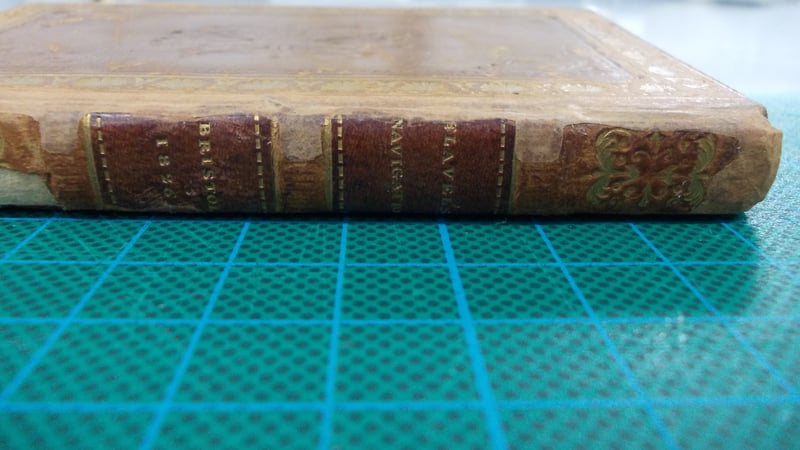 A few weeks ago I received The Navigation Spiritualized or A New Compass for Seamen, written by John Flavel in the 19th century: a tiny but amazing book to conserve! The book is a brown full leather binding sewn on three cords which are laced into the boards. It has red leather labels tooled in gold on the spine. The front and the back cover, the board edges and the inner turn-ins are equally decorated with blind and gold tooling.