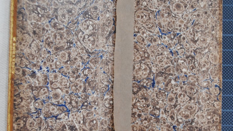 A hinge was also created with a thin strip of Japanese paper (coloured with acrylics to match the colour of the marbled endpapers), in order to consolidate the inner hinges of the boards, which were fragile. This Japanese paper was pasted with wheat starch paste (10% w/v) to the flyleaf and the other half to the board.