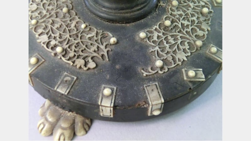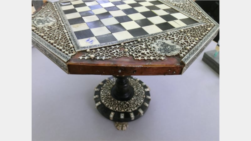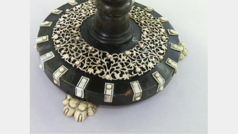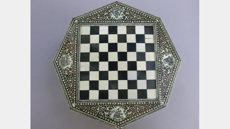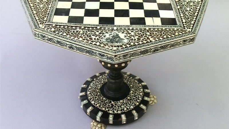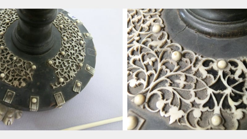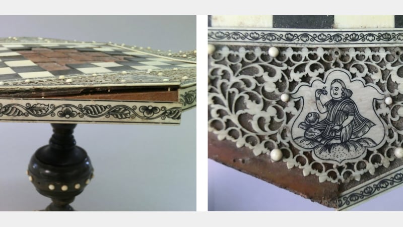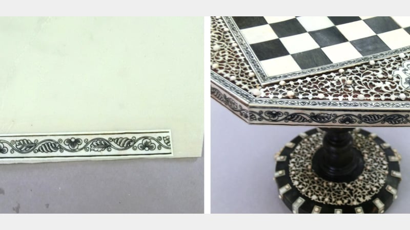 This is a privately owned 19th century Anglo-Indian chessboard on a turned stand from South-East India. It has a sandalwood substrate decorated with ivory fretwork on a turtleshell background. The ivory side bandings are engraved and highlighted with a black lacquer. The contrasting squares are made from ivory and a black horn, possibly buffalo horn. The column is made from separate sections of turned horn and the paw feet are carved in bone. Interestingly, there was no ebony found on this object.