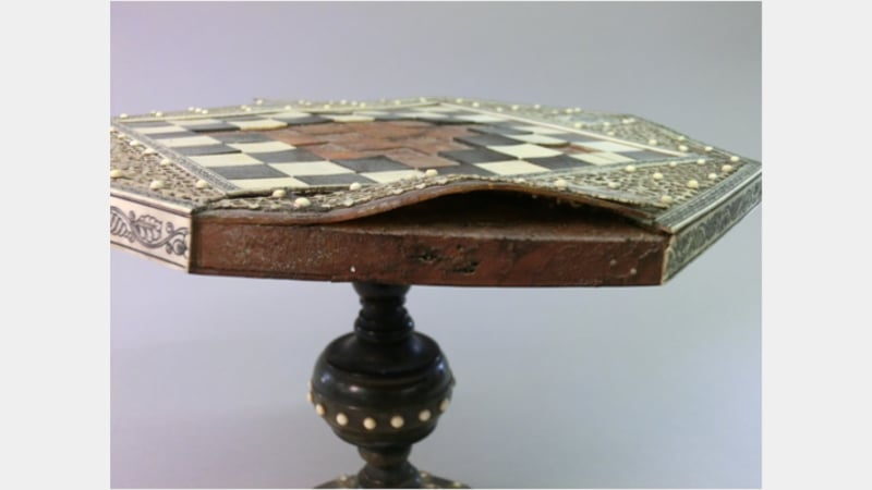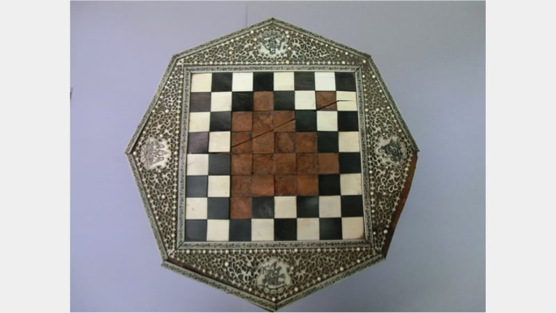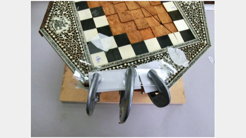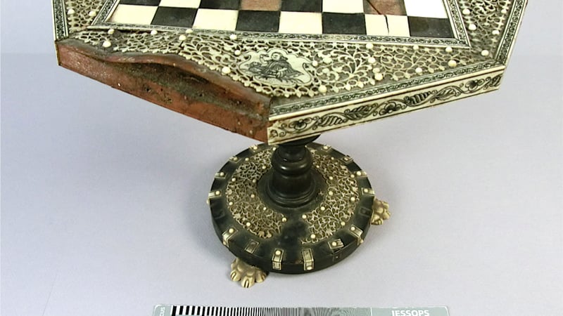 The chessboard had suffered from humidity fluctuations, eventually resulting in a split in the wooden substrate. Furthermore shrinkage and permanent deformation of the substrate had resulted in a distortion of the tortoiseshell and the loss of ivory side banding as well as the loss of a great number of squares.