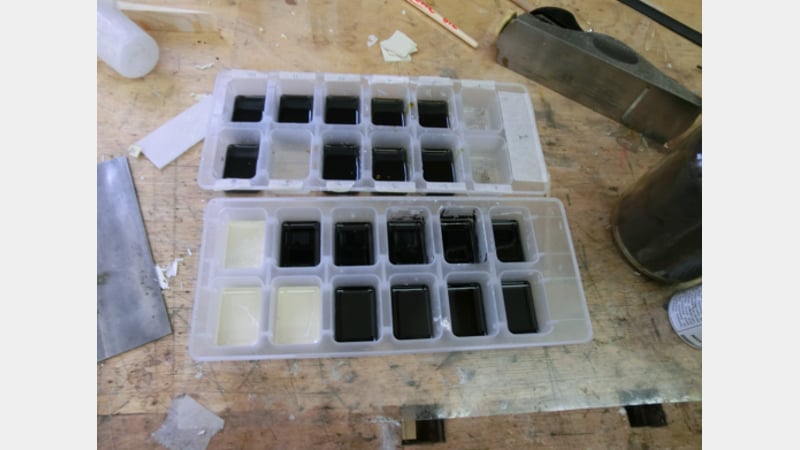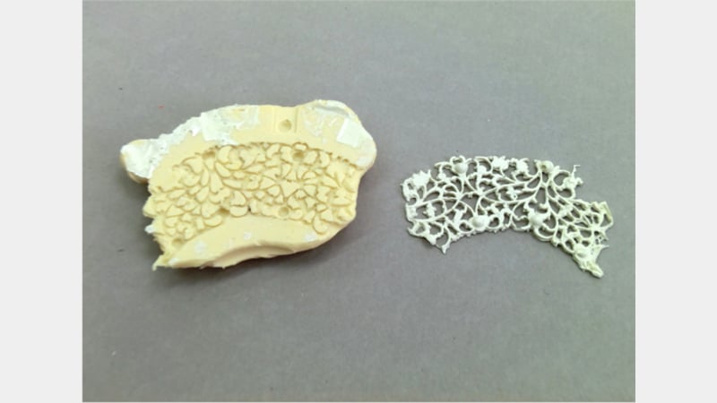 To replace the loss of ivory fretwork on the base, a silicon mould was taken from a complete section of fretwork on the base. Epoxy resin mixed with pigments and fumed silica to increase the viscosity was then poured into the mould. After the resin had cured it was removed and cut to the size of the loss. The new piece was glued onto the horn background with a synthetic adhesive.