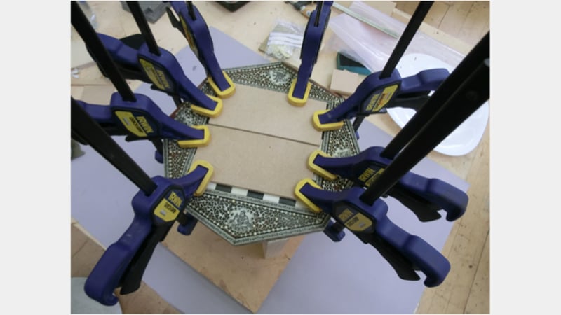 The distorted turtleshell was partly released from the surface and by softening it with heat and steam from a hot and damp cotton cloth. Once released and softened it partly regained its original flat shape. Because the substrate had shrunk there was a small excess of turtleshell on one edge. This had to be trimmed off to make it fit before gluing back onto the substrate.