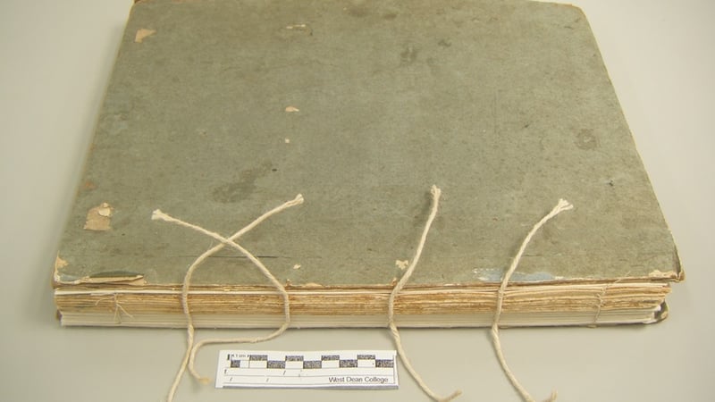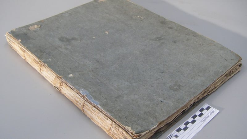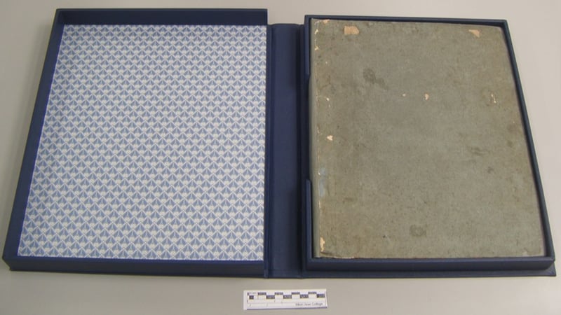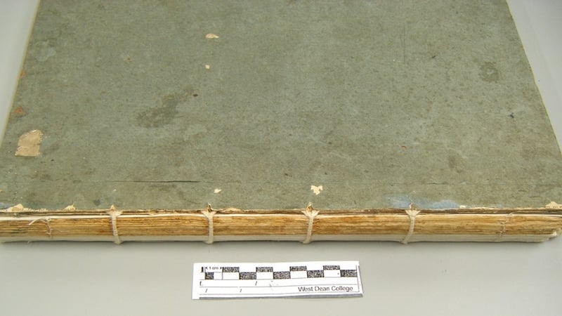 A new spine piece was then created using two different western handmade papers laminated together to match the (guessed) original as closely as possible. This was then pasted between the boards and the lifted paper cover.