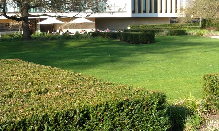 Dramatic Yew bluffs were created to link the new Café terrace with the old Cory Lodge lawn, with trendy corten-steel ramp sides protecting the exit paths.