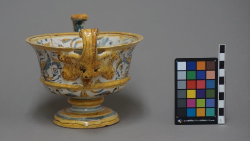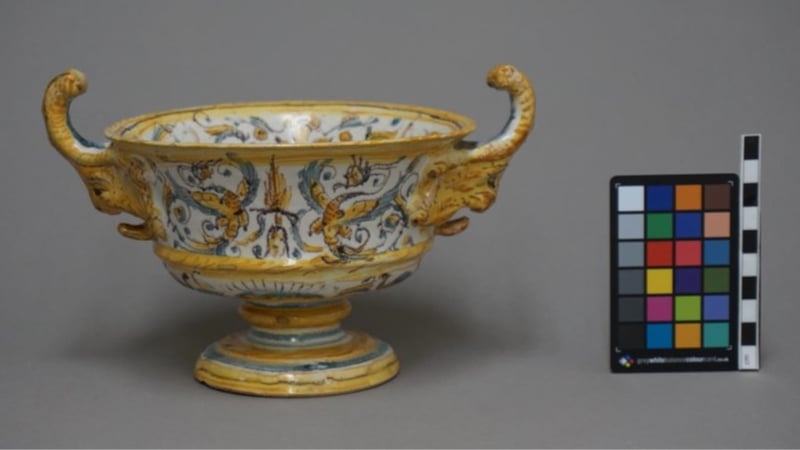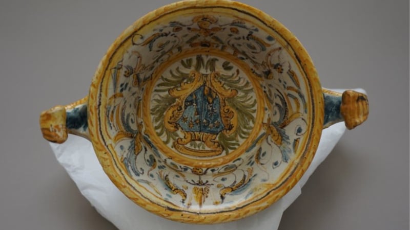In December 2019, we were delighted to be asked by The Courtauld Collection to treat a small two-handled Italian maiolica armorial bowl (inventory number O.1966.GP.246), made in the Marche region, probably in Pesaro or Castel Durante, around 1650-1700.