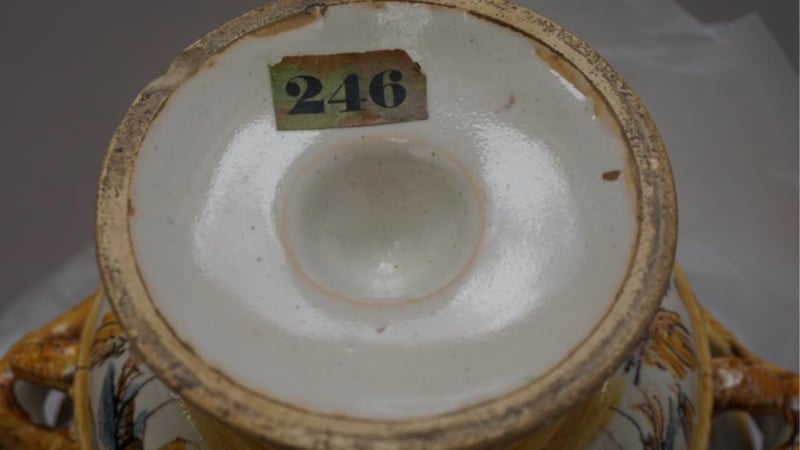 Maiolica refers to tin-glazed earthenware ceramics, which were first made during the Italian renaissance. The object in question has a light grey coloured opaque tin glaze, forming a background on which yellow and blue birds have been applied with thin black lines. The vase’s decoration depicts a coat of arms and grotesque design motifs. Two handles decorated with a yellow tone are adorned with ornate grotesques sticking their tongues out with their hair stretched to join the body of the object. This decoration could indicate maritime symbolism. On the base is a paper label with the number 246 attached (the inventory number of the former owner, Thomas Gambier Parry). The inventory numbers were kept and integrated into the accession numbers when the collection was acquired by The Courtauld in 1966.