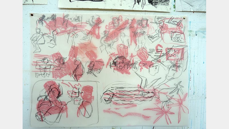 London-based artist George Charman led a two-day workshop in the West Dean College Orangery based on the theme of 'Drawing from Site'. Over the different sessions, a series of ostensibly simple tasks were prepared, by both tutor and students, that involved experimental strategies for extending and disrupting drawing practice in direct response to sites in and around the West Dean Estate. Tasks ranged from responding to details of architecture, observed landscape or specific journeys or events. The Orangery soon filled with innumerable drawings of all types, textured surfaces and three-dimensional objects, with some experiments exploring duration and timings, multiple angles and working in series. Individuals constructed 'drawing machines' by harnessing natural forces to create marks, whilst others drew blind or from memory. The shifts and inconsistencies between written instructions and any drawing action was a consistent theme throughout. Working both individually and in collaboration, a number of diverse materials and techniques were used: graphite, chalk, charcoal, ink, pigment; paper scrolls and sheets, acetate projections, frottage, folding, etc. A splendid time was had by all.