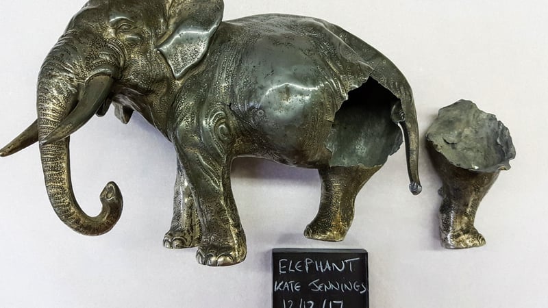 Most of the issues with the elephant derive from whatever incident caused his hind leg to become detached. These include (a) the detachment of the leg itself, (b) a number of cracks radiating out from the detachment point, (c) deformation of the main body and leg and (d) some loss of material around the break points.