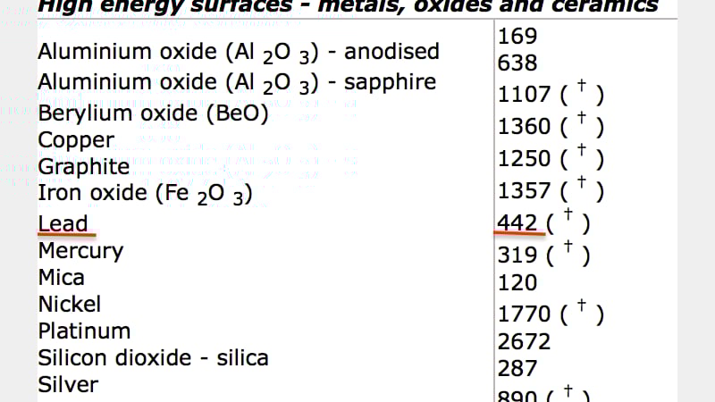 Hard solids (such as metals and ceramics) have high surface energy as a result of the types of molecular bonding (cohesive forces) present. Below are two table showing (respectively) examples of surface tensions and surface energies - this clearly shows that the surface tension of epoxy resins is significantly lower than that of lead. Epoxy resins are therefore a good choice of adhesive for a lead substrate, and will be a good starting place when selecting adhesives for the repairs to be made to the elephant.