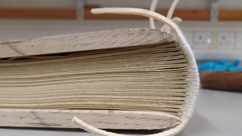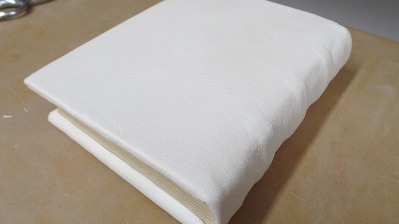 The book is covered in alum-tawed skin, which has a characteristic white colour and lasts for much longer than tanned leather. It is preserved using aluminium salts instead of tannins bound to the molecules in the leather. The alum can be washed out and the skin can putrify, so it isn't technically leather, but it makes incredibly durable bindings if kept dry. The sewing supports are also alum taw, so the board attachment is very strong.
