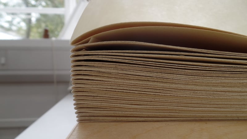 Early Gothic bindings were manuscripts on parchment, produced slowly by scribes, until the printing press was invented in 1440. After that there were a lot more books in want of bindings. Paper became cheaper and more abundant than parchment. Printers loved it, so that was another innovation binders had to contend with. Initially, binders did not trust paper to hold up when sewn, so they sometimes put little folds of parchment in the center of sections to keep the sewing from tearing through.